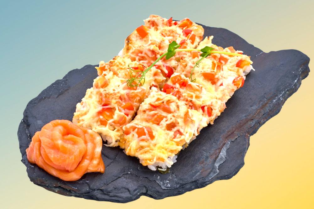 Состав - нори, экстра рис, филе лосося, томат, перец, соус для суши-пицц, сыр натуральный Гауда, унаги, кунжут - 280 гр.